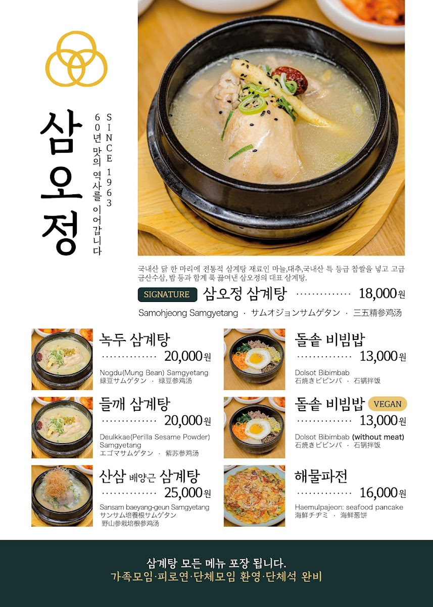 국내산 닭 한 마리에 전통적 삼계탕 재료인 마늘, 대추, 국내산 특 등급 찹쌀을 넣고 고급 금산수삼, 밤 등과 함계 푹 끓여낸 삼오정의 대표 삼계탕. Samohjeong Samgyetang Garlic, jujube, Korean special grade glutinous rice, which are traditional ingredients for Samgyetang, are added to one domestic chicken. Samohjeong's representative Samgyetang, which is boiled with premium Geumsan fresh ginseng, chestnuts, etc. 三五精参鸡汤 在韩国产的一只鸡中加入传统参鸡汤材料大蒜、大枣、韩国产特级糯米,用高级金山水参、 栗子等熬制而成的三五精的代表参鸡汤。 サムオジョンサムゲタン 韓国産鶏に伝統的なサムゲタンの材料であるニンニク、ナツメ、韓国産特等級もち米を入れて高級クムサン高麗人参、栗などと一緒にじっくり煮込んだサムオジョンの代表サムゲタン.
